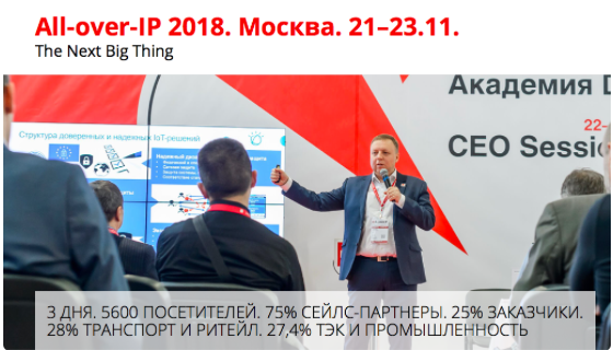 11-й форум All-over-IP 2018 Формирует содержание в соответствии с требованиями времени, развивает сервисы в интересах поставщиков и покупателей, открывает новые возможности для бизнеса, объединяет участников индустрии в сообщество. Это маст хэв для передовых брендов и молодых компаний, желающих достигать результатов. Генеральный спонсор: ITV | AxxonSoft 21–23 ноября 2018 Москва, КВЦ "Сокольники"